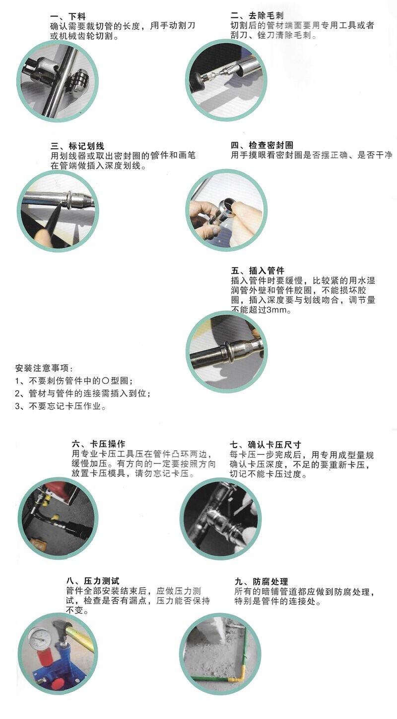 用专业卡压工具压在管件凸环两边,缓慢加压。有方向的一定要按照方向放置卡压模具,请勿忘记卡压。